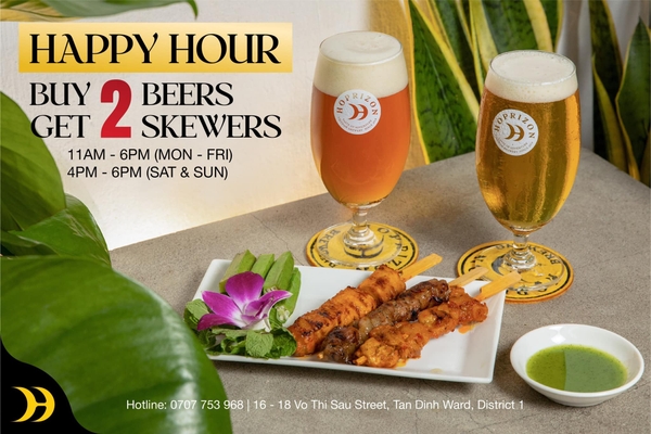 Hiểu khách hàng cần gì vào những buổi trưa chiều nắng nóng, HOPRIZON TAPROOM mang đến ưu đãi GỌI 2 BIA TẶNG 2 XIÊN NƯỚNG.